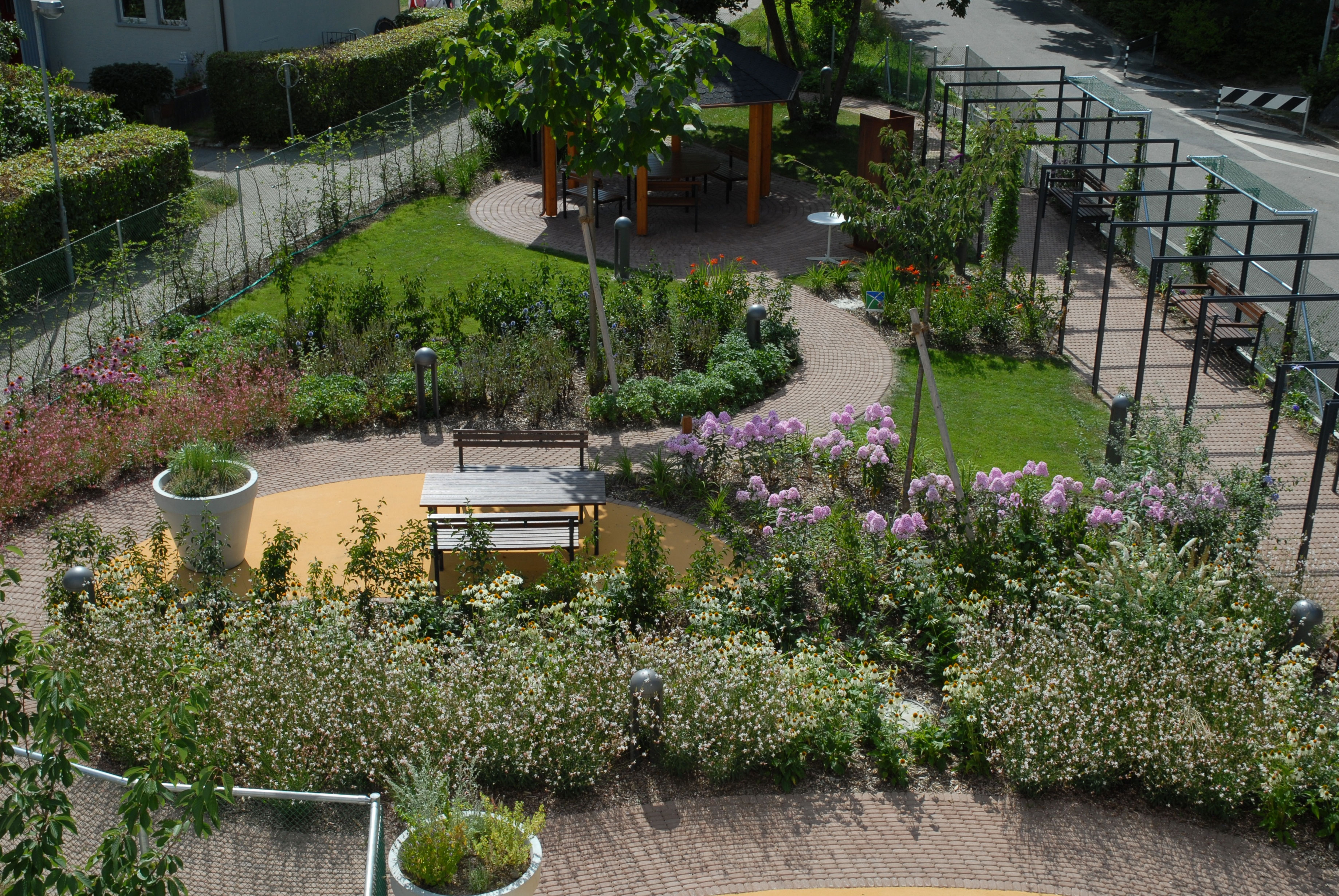 Der farbenvielfältige und abwechslungsreiche Sinnesgarten ist ein Ort zum Wohlfühlen. Ein interessantes, beleuchtetes und zusammenhängendes Wegsystem ermöglicht das gefahrlose Erkunden des Gartens. Bäume, kleine Sitzgruppen und ein plätschernder Brunnen laden zum Verweilen ein. Die kleine, grüne Idylle – ein Stück Natur – hat im Langzeitgedächtnis und in der Lebensbeschreibung (Biografie) meistens bereits einen festen Platz. Emotional gestaltete Gärten bauen eine wichtige Brücke zur Welt von Menschen mit Demenz.